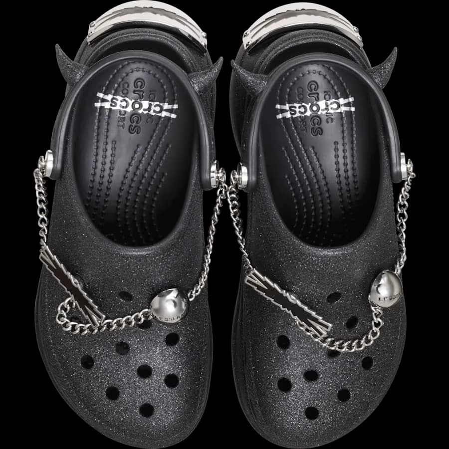 Dubbed the Bae Clog, the collaboration reimagines Crocs’ iconic silhouette with a striking black glitter design. A metallic bumper plate featuring the LE SSERAFIM logo sits along the front, giving the shoe a polished, industrial finish. The heel strap adds a playful twist, complete with a set of horn-like accents and custom Jibbitz charms that nod to the group’s confident image.